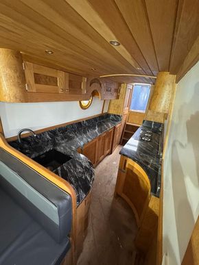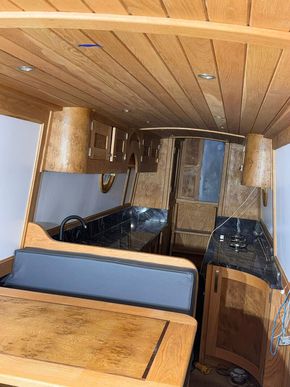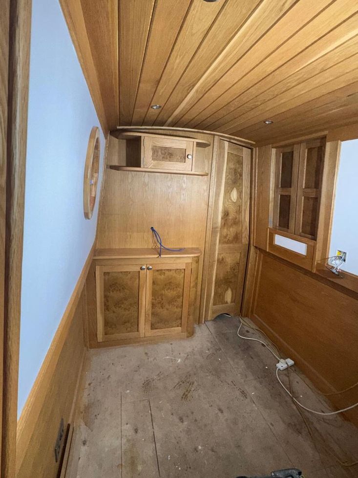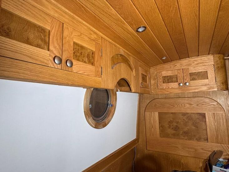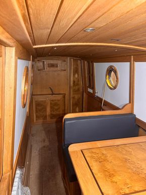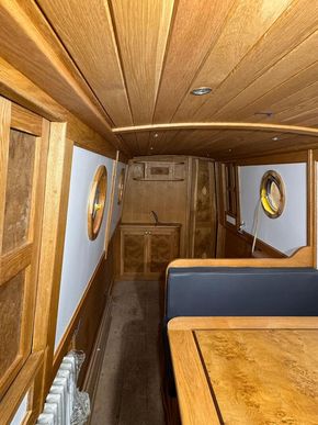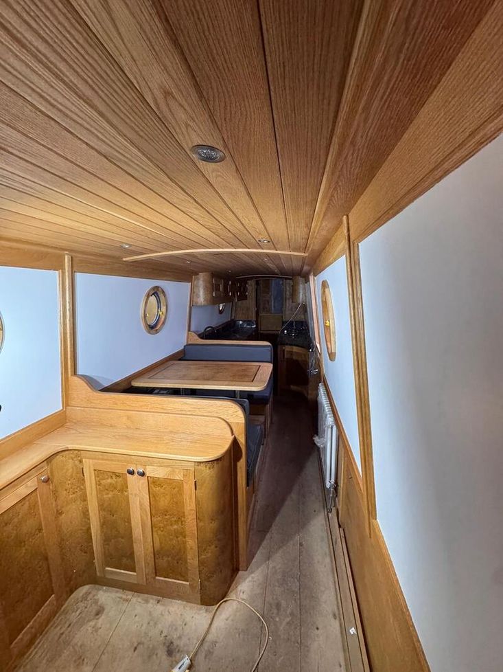 Inside, the boat features a high-quality solid oak fit-out throughout, with beautifully crafted cabinetry, panelled ceilings, and extensive storage. The semi-reverse layout offers a practical helm position while maximising internal living space.