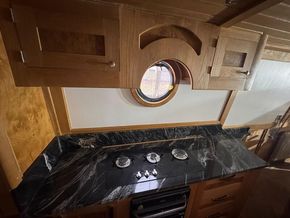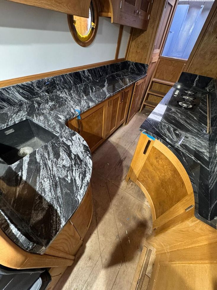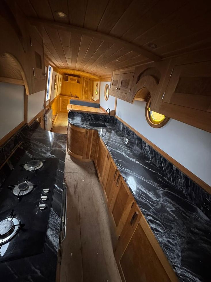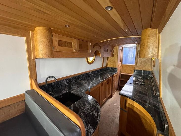 The galley is fully equipped and finished with granite worktops, incorporating a washing machine, modern cooking facilities, ample storage, and generous workspace. Matching granite worktops are also fitted in the bathroom, adding a luxury feel.